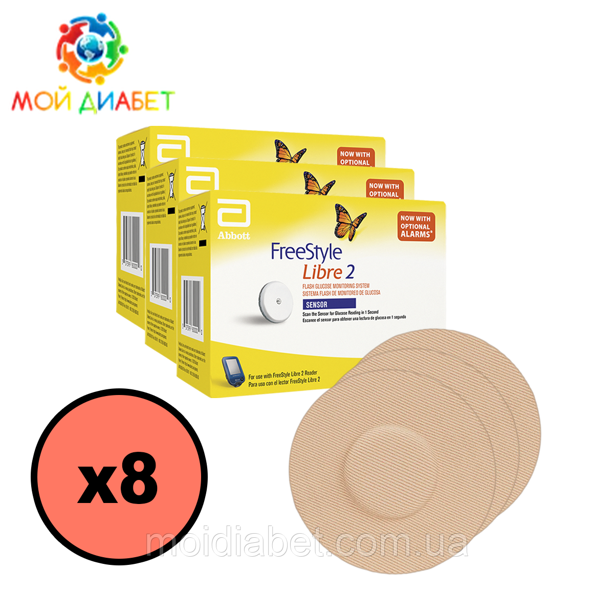 Цей комплект містить 8 сенсорів Freestyle Libre 2 і вісім тейпів для зручності використання.